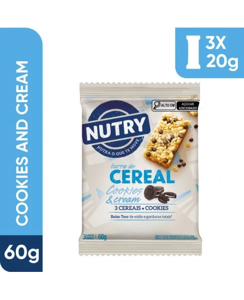 ALIMENTOS>BARRAS DE CEREAIS>Barra de Cereais Cookies & Cream - Nutry - Multipack 3 X 20g - Com 3 Cereais e Cookies