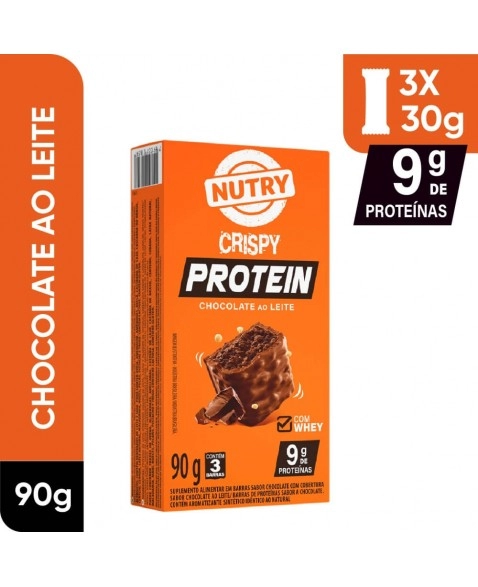 ALIMENTOS>BARRAS DE PROTEÍNAS>Barra de Proteínas Crispy Chocolate ao Leite - Nutry - Caixeta 3 x 30g - Com Whey e 9g de Proteínas