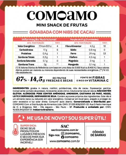 INGREDIENTES: goiaba in natura, maltitol, polidextrose, nibs de cacau. Espessante: pectina. Conservante: sorbato de potássio. Acidulante: ácido cítrico. Edulcorante natural: stevia.