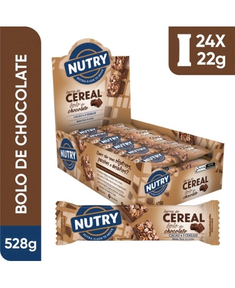 CATEGORIA ALIMENTAR>ZERO>Barra de Cereais Bolo De Chocolate - Nutry - Display 24 X 22g - Com 3 Cereais e Cacau