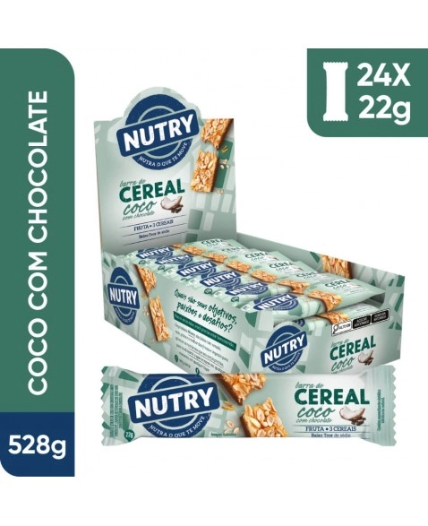 CATEGORIA ALIMENTAR>ZERO>Barra de Cereais Coco com Chocolate - Nutry - Display 24 X 22g - Com 3 Cereais e Fruta
